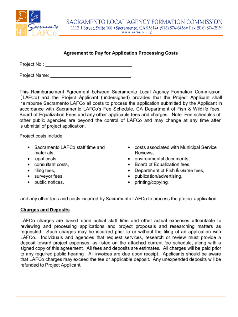 Agreement to Pay for Application Processing Costs Project No.: ___ Project Name: ___ This Reimbursement Agreement between Sacramento Local Agency Formation Commission ( LAFCo) and the Project Applicant