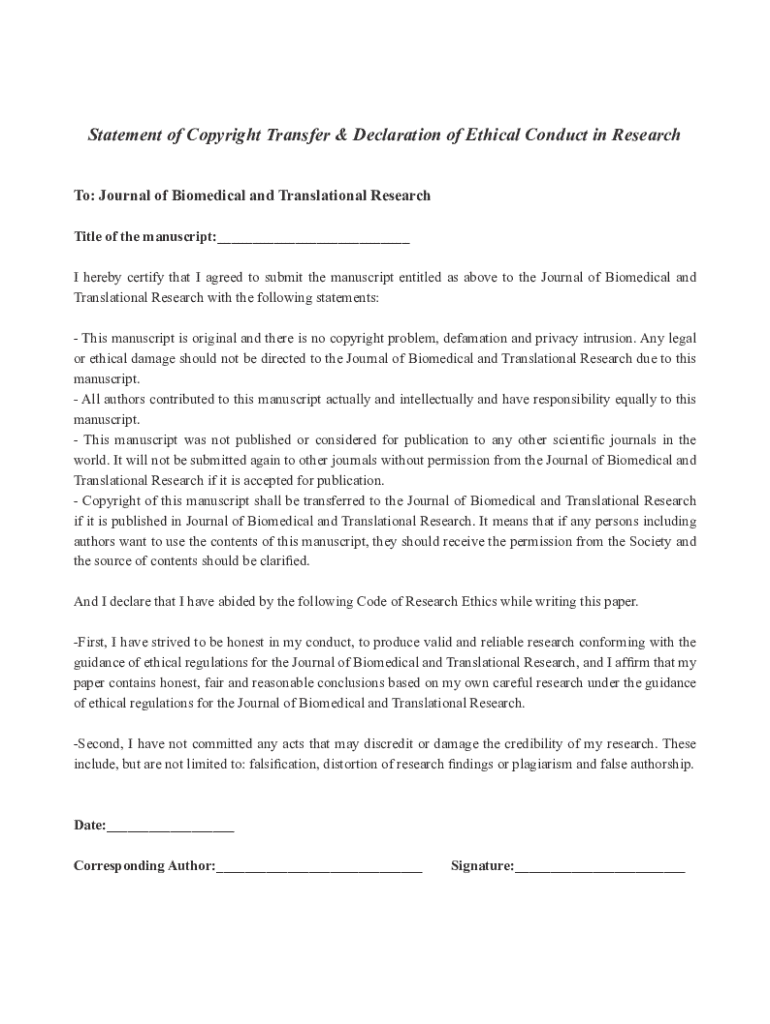 Get the free Statement of Copyright Transfer & Declaration of Ethical ...