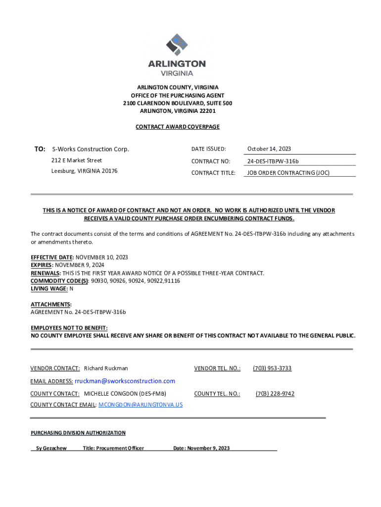 ARLINGTON COUNTY, VIRGINIA OFFICE OF THE PURCHASING AGENT 2100 CLARENDON BOULEVARD, SUITE 500 ARLINGTON, VIRGINIA 22201 CONTRACT AWARD COVERAGE: Works Construction Corp. DATE ISSUED:October 14, 2023212
