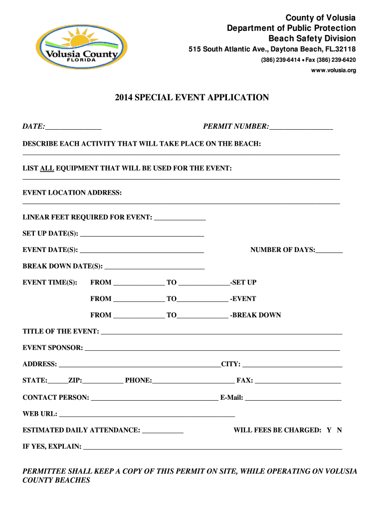 County of V lush Department of Public Protection Beach Safety Division 515 South Atlantic Ave., Daytona Beach, FL.32118 (386) 239-6414 Fax (386) 239-6420 www.volusia.org 2014 SPECIAL EVENT APPLICATION