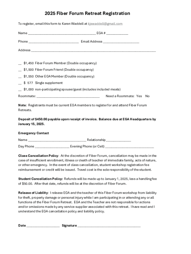 2025 Fiber Forum Retreat Registration To register, email this form to Karen Waddell at kjswaddell@gmail.com Name ___ EGA # ___ Phone ___ Email Address ___ Address ___ __ $1,450 Fiber Forum Member