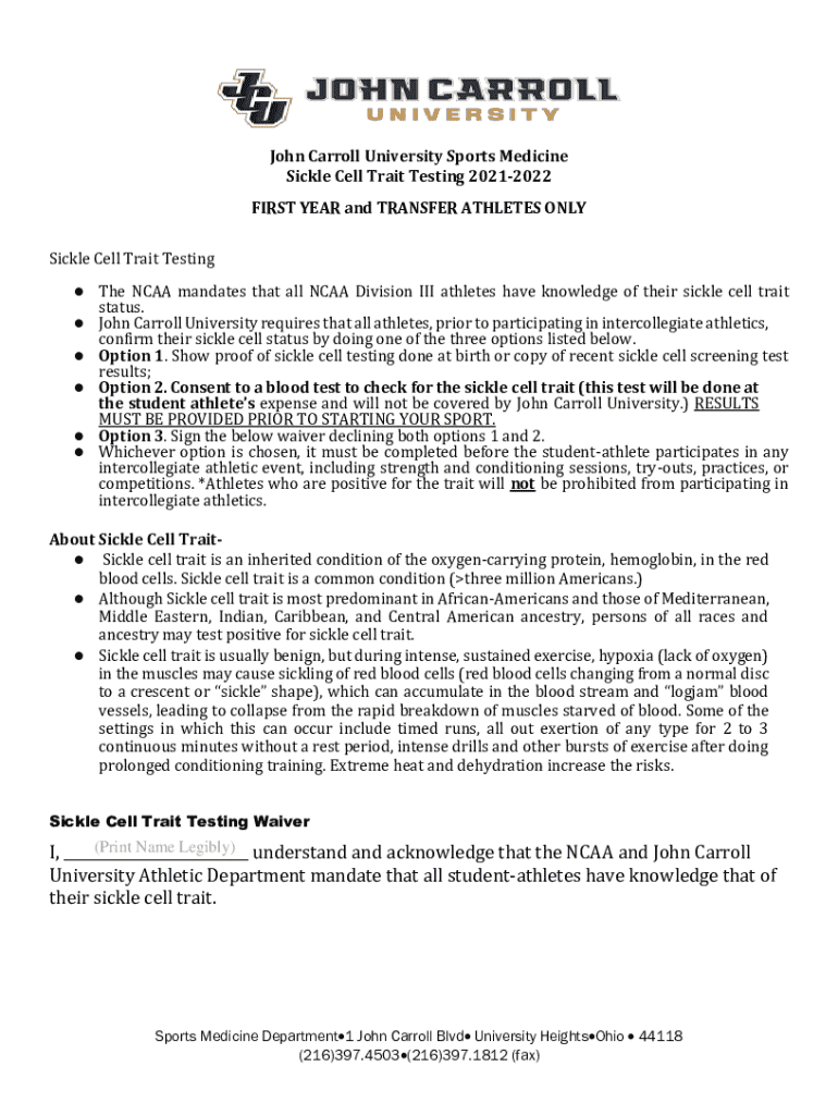 Get the free John Carroll University Sports Medicine Sickle Cell Trait ...