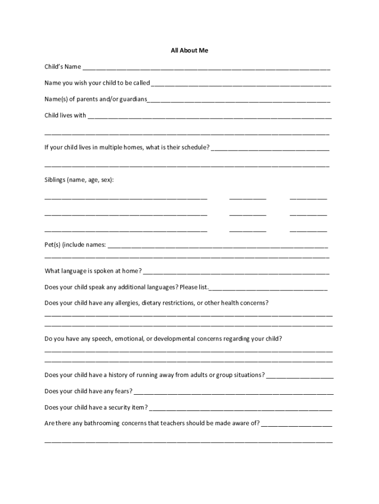 All About Me Childs Name ___ Name you wish your child to be called ___ Name(s) of parents and/or guardians___ Child lives with ___ ___ If your child lives in multiple homes, what is their schedule?