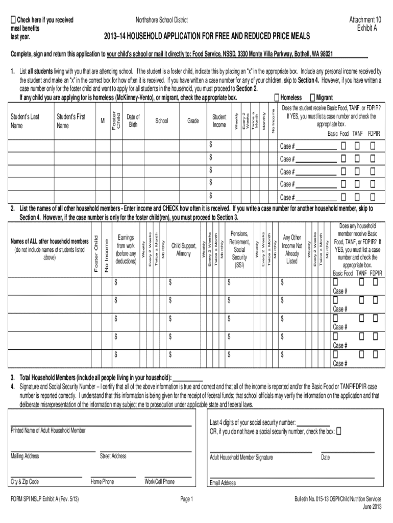 Exhibit ANorthshore School District201314 HOUSEHOLD APPLICATION FOR FREE AND REDUCED PRICE MEALSComplete, sign and return this application