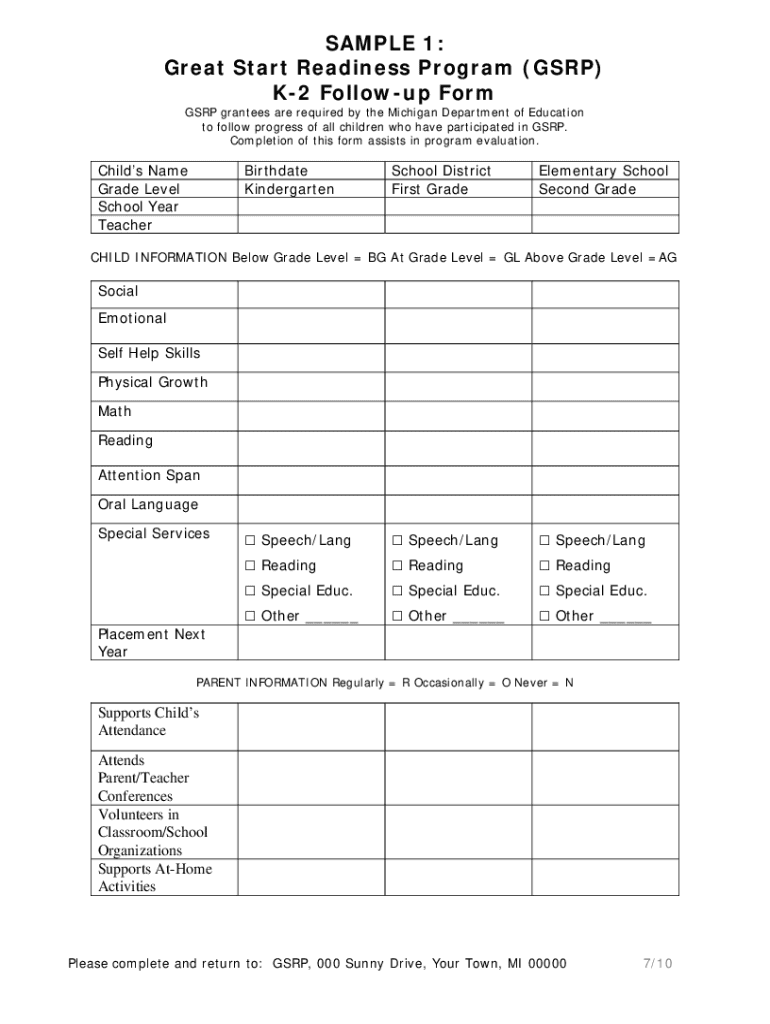 SAMPLE 1: Great Start Readiness Program (GSRP) K2 Followup Form GSRP grantees are required by the Michigan Department of Education to follow progress of all children who have participated in GSRP.