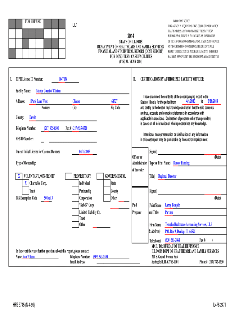 FOR BHF USELL1 2014 STATE OF ILLINOIS DEPARTMENT OF HEALTHCARE AND FAMILY SERVICES FINANCIAL AND STATISTICAL REPORT (COST REPORT) FOR LONGER CARE FACILITIES (FISCAL YEAR 2014)I.DPH License ID Number:
