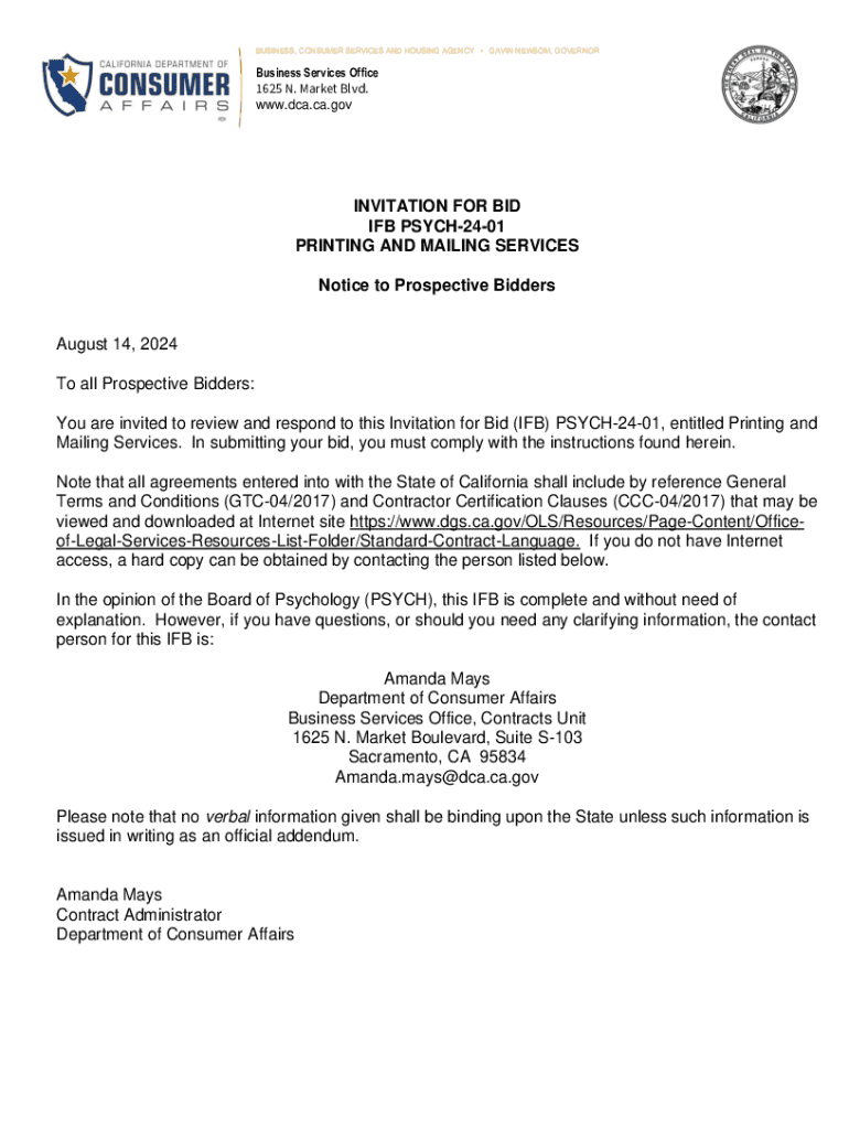 BUSINESS, CONSUMER SERVICES AND HOUSING AGENCY GAVIN NEWSOM, GOVERNORBusiness Services Office1625 N. Market Blvd. www.dca.ca.govINVITATION FOR BID IFB PSYCH2401 PRINTING AND MAILING SERVICES Notice