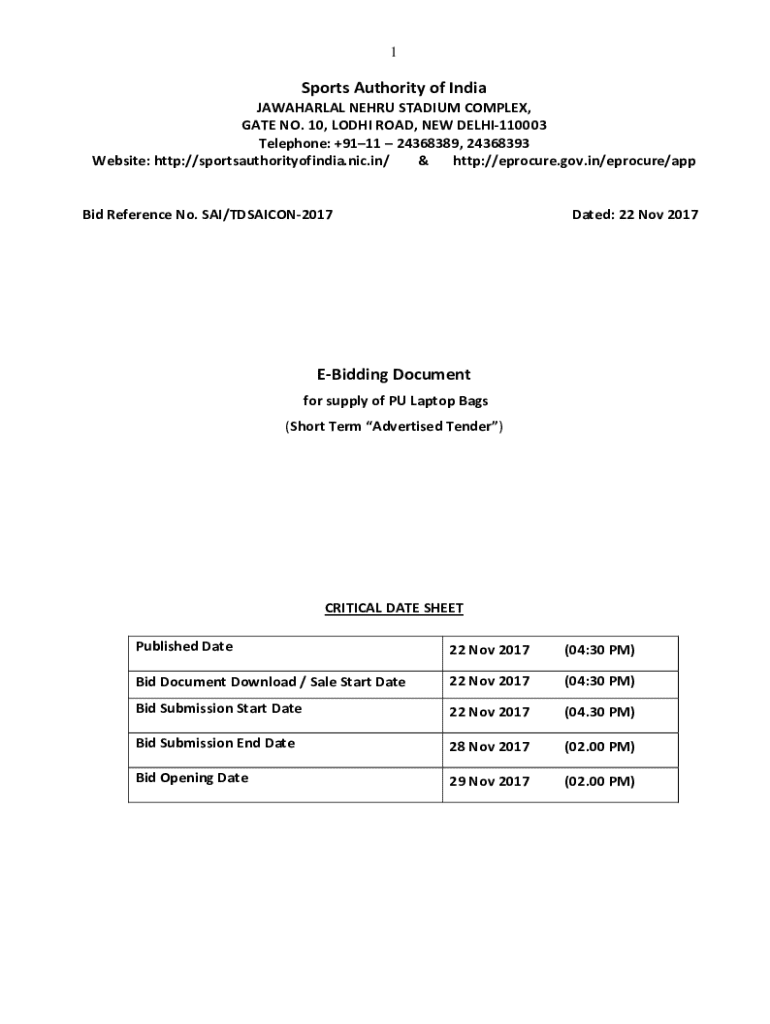 1Sports Authority of India JAWAHARLAL NEHRU STADIUM COMPLEX, GATE NO. 10, LODI ROAD, NEW DELHI110003 Telephone: +9111 24368389, 24368393 Website: http://sportsauthorityofindia.nic.in/ & http://eprocure.gov.in/eprocure/appBid