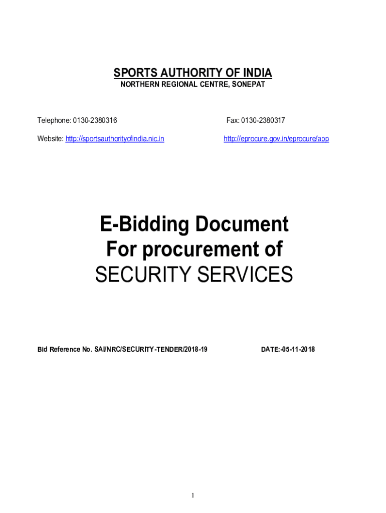 SPORTS AUTHORITY OF INDIA NORTHERN REGIONAL CENTRE, SONEPATTelephone: 01302380316Fax: 01302380317Website: http://sportsauthorityofindia.nic.inhttp://eprocure.gov.in/eprocure/appEBidding Document For