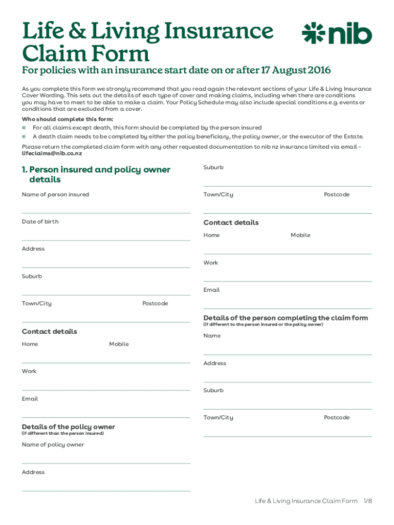 Life & Living Insurance Claim FormFor policies with an insurance start date on or after 17 August 2016 As you complete this form we strongly recommend that you read again the relevant sections of