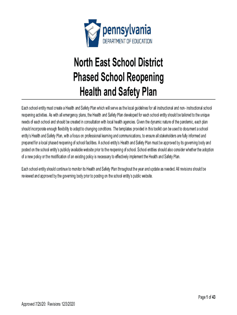 This Health and Safety Plan outlines the phased reopening strategies and protocols for the North East School District in light of COVID-19, ensuring stakeholder communication and safety measures.