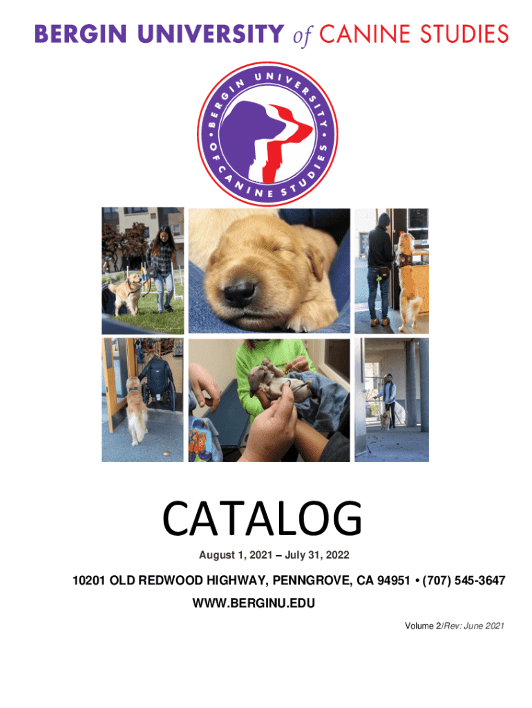 CATALOG August 1, 2021 July 31, 202210201 OLD REDWOOD HIGHWAY, PENNGROVE, CA 94951 (707) 5453647 WWW.BERGINU.EDU Volume 2/Rev: June 20211Table of ContentsWelcome from the President Historical Background, Vision, Mission Objectives3Accreditation, Approvals, and Affiliations Institutional Overview Degree Programs Assistance Dog Institute A.S. in Assistance Dog Education School of Business and Companion Dogs M.S. in HumanCanine Life Sciences M.S. Course Descriptions B.S. in Canine Studies...