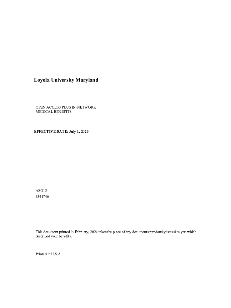KoLoyola University MarylandOPEN ACCESS PLUS INNETWORK MEDICAL BENEFITSEFFECTIVE DATE: July 1, 2023ASO12 3341746This document printed in February, 2024 takes the place of any documents previously