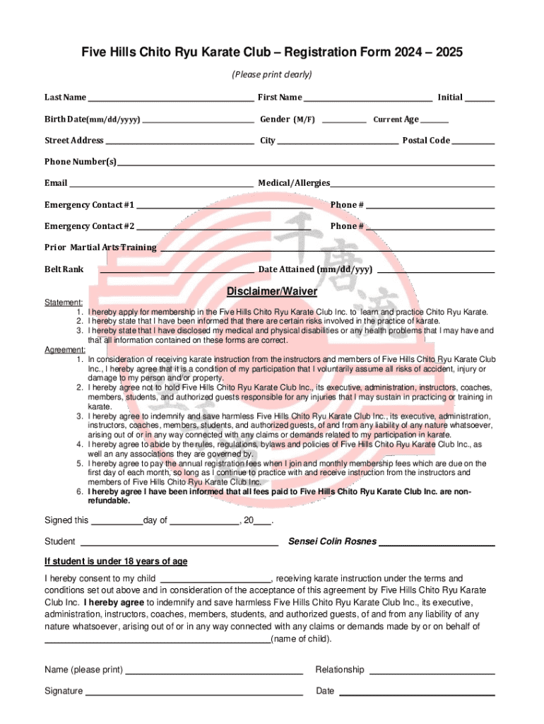 Five Hills Chito Ryu Karate Club Registration Form 2024 2025 (Please print clearly) Last NameFirst NameBirth Date(mm/dd/yyyy)Gender (M/F)Street AddressCityInitial Current AgePostal CodePhone Number(s) EmailMedical/AllergiesEmergency Contact #1Phone #Emergency Contact #2Phone #Prior Martial Arts Training Belt RankDate Attained (mm/dd/yyy)Disclaimer/Waiver Statement: 1. I hereby apply for membership in the Five Hills Chito Ryu Karate Club Inc. to learn and practice Chito Ryu Karate