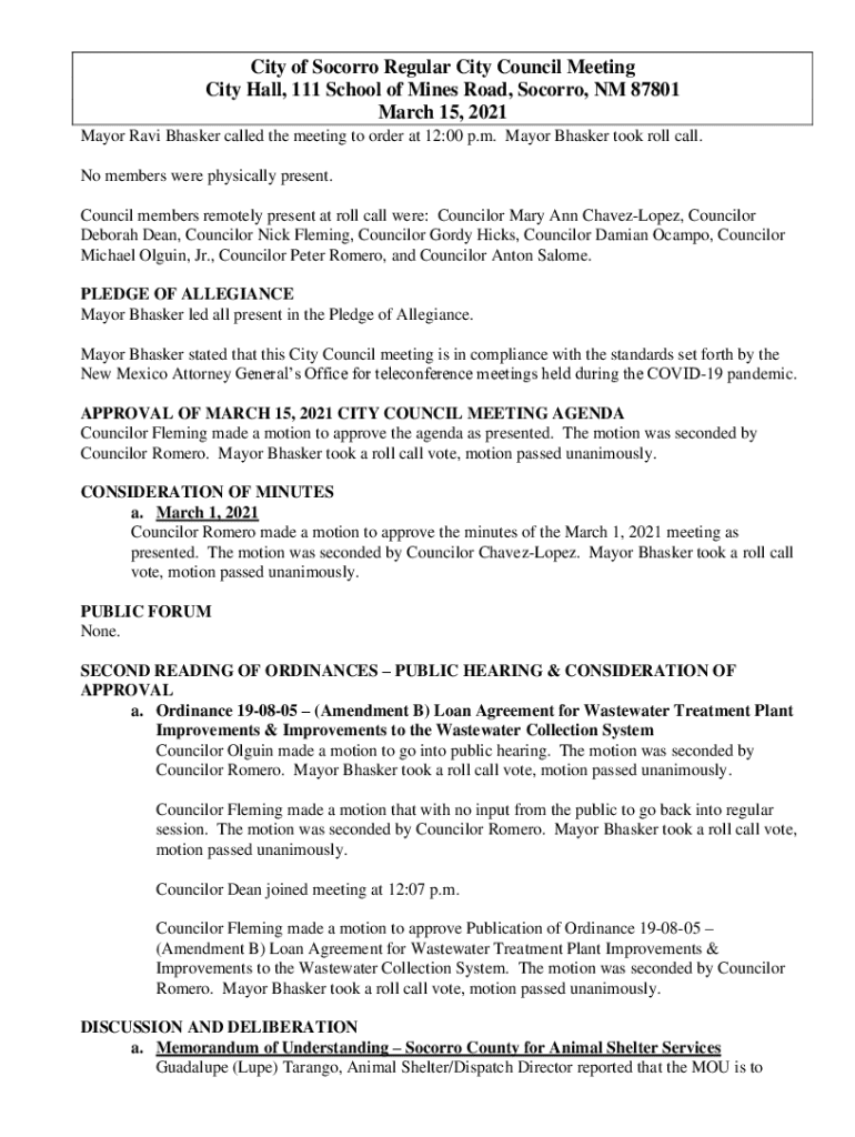 City of Socorro Regular City Council Meeting City Hall, 111 School of Mines Road, Socorro, NM 87801 March 15, 2021 Mayor Ravi Bhasker called the meeting to order at 12:00 p.m. Mayor Bhasker took roll