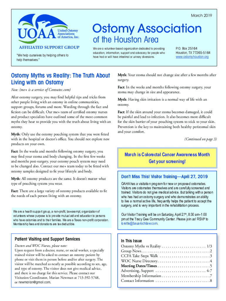 March 2019Ostomy Association $)),/,$7(\'6833257*5283 We help ourselves by helping others to help themselves.of the Houston AreaWe are a volunteerbased organization dedicated to providing education,