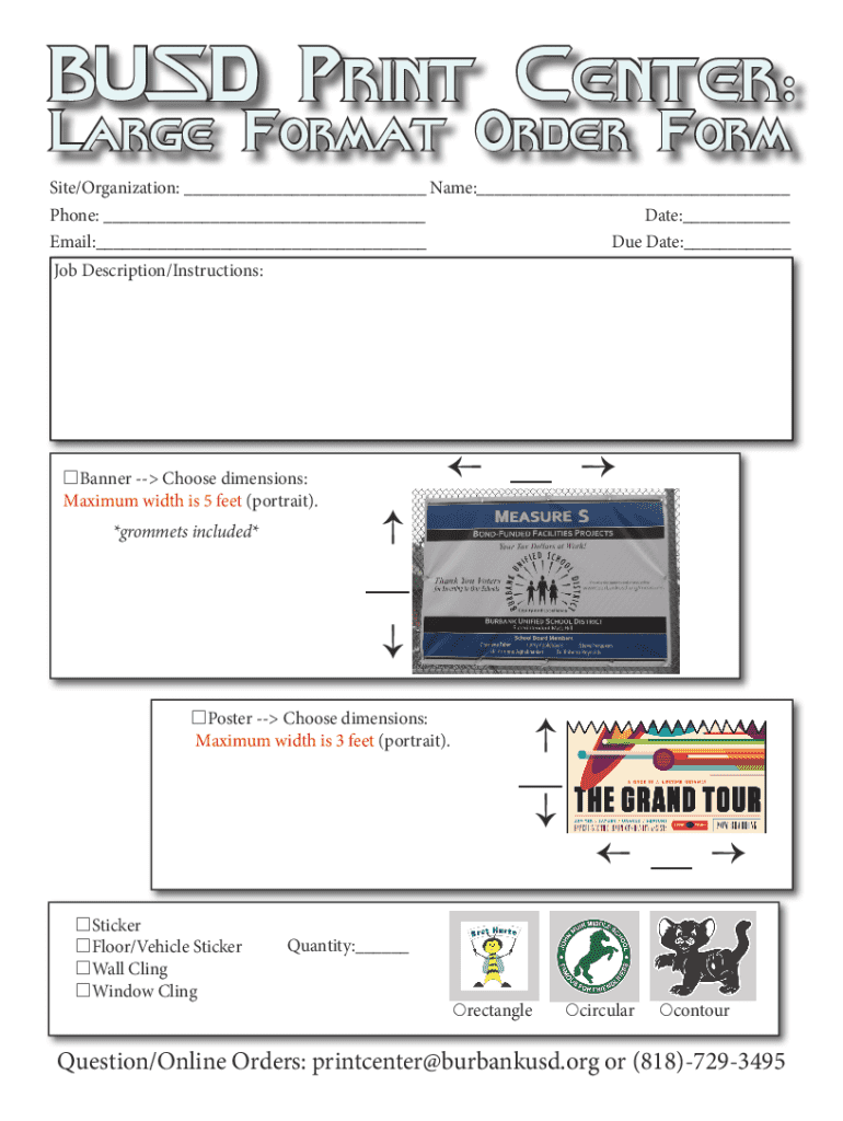 BUSD Print Center: Large Format Order Form Site/Organization: ___ Name:___ Phone: ___Date:___ Email:___Due Date:___ Job Description/Instructions:*grommets included* __ Banner Choose dimensions: Maximum width is 5 feet (portrait).__Sticker Floor/Vehicle Sticker Wall Cling Window Cling Poster Choose dimensions: Maximum width is 3 feet (portrait).__ __ Quantity:___ rectanglecircularcontourQuestion/Online Orders: printcenter@burbankusd