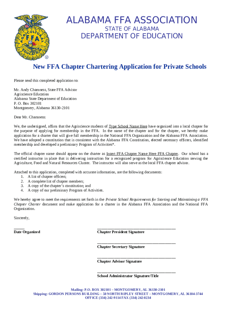 Template New FFA Chapter Chartering Application for Public Schools instructions