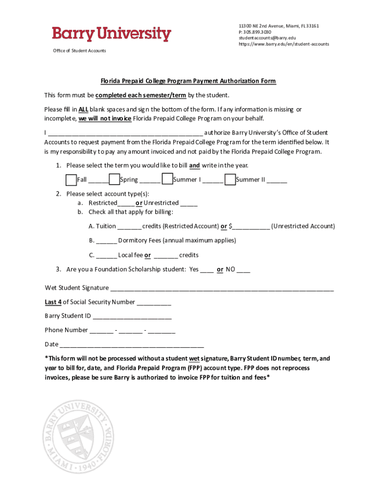 11300 NE 2nd Avenue, Miami, FL 33161 P: 305.899.3030 studentaccounts@barry.edu https://www.barry.edu/en/studentaccounts Office of Student AccountsFlorida Prepaid College Program Payment Authorization