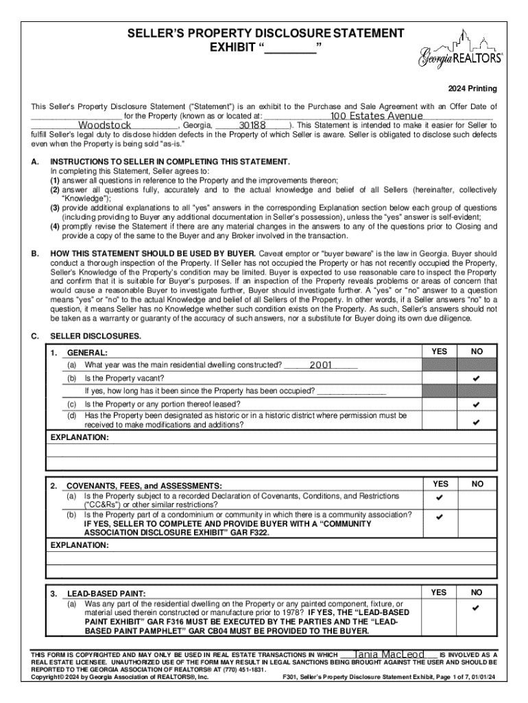 SELLERS PROPERTY DISCLOSURE STATEMENT EXHIBIT ___2024 Printing This Sellers Property Disclosure Statement (Statement) is an exhibit to the Purchase and Sale Agreement with an Offer Date of ___ for