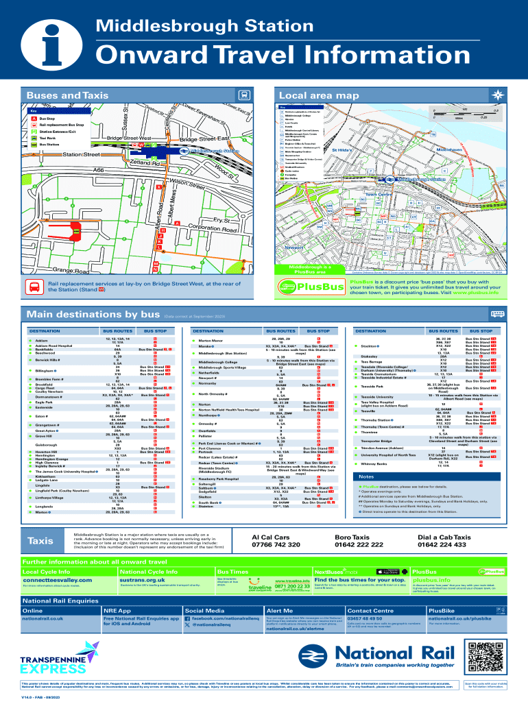 iMiddlesbrough StationOnward Travel InformationBuses and TaxisLocal area mapMiddlesbrough is a PlusBus areaContains Ordnance Survey data Crown copyright and database right 2023 & also map data OpenStreetMap contributors, CC BYSAPlusBus is a discount price bus pass that you buy with your train ticket. It gives you unlimited bus travel around your chosen town, on participating buses. Visit www.plusbus.infoRail replacement services at layby on Bridge Street West, at the