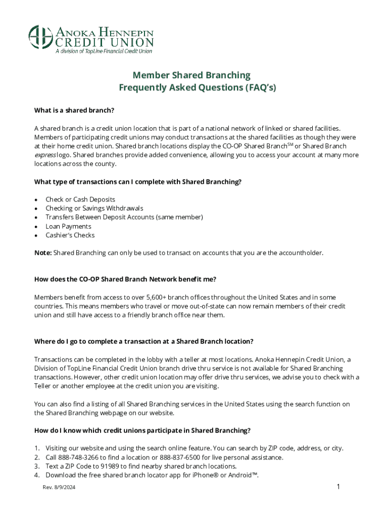 Member Shared Branching Frequently Asked Questions (FAQs) What is a shared branch? A shared branch is a credit union location that is part of a national network of linked or shared facilities. Members