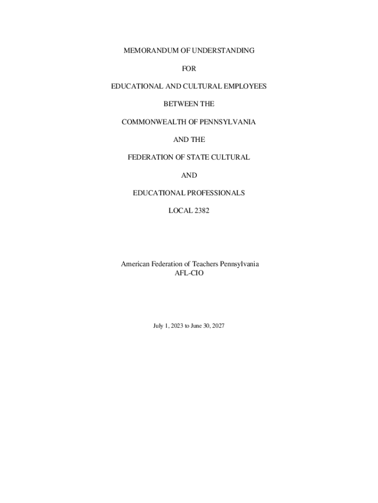 MEMORANDUM OF UNDERSTANDING FOR EDUCATIONAL AND CULTURAL EMPLOYEES BETWEEN THE COMMONWEALTH OF PENNSYLVANIA AND THE FEDERATION OF STATE CULTURAL AND EDUCATIONAL PROFESSIONALS LOCAL 2382American Federation