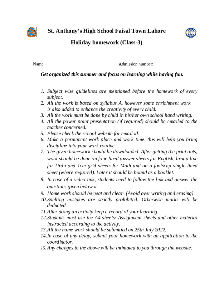 Template Holidays Homework - St. Anthony High School Faisal Town instructions