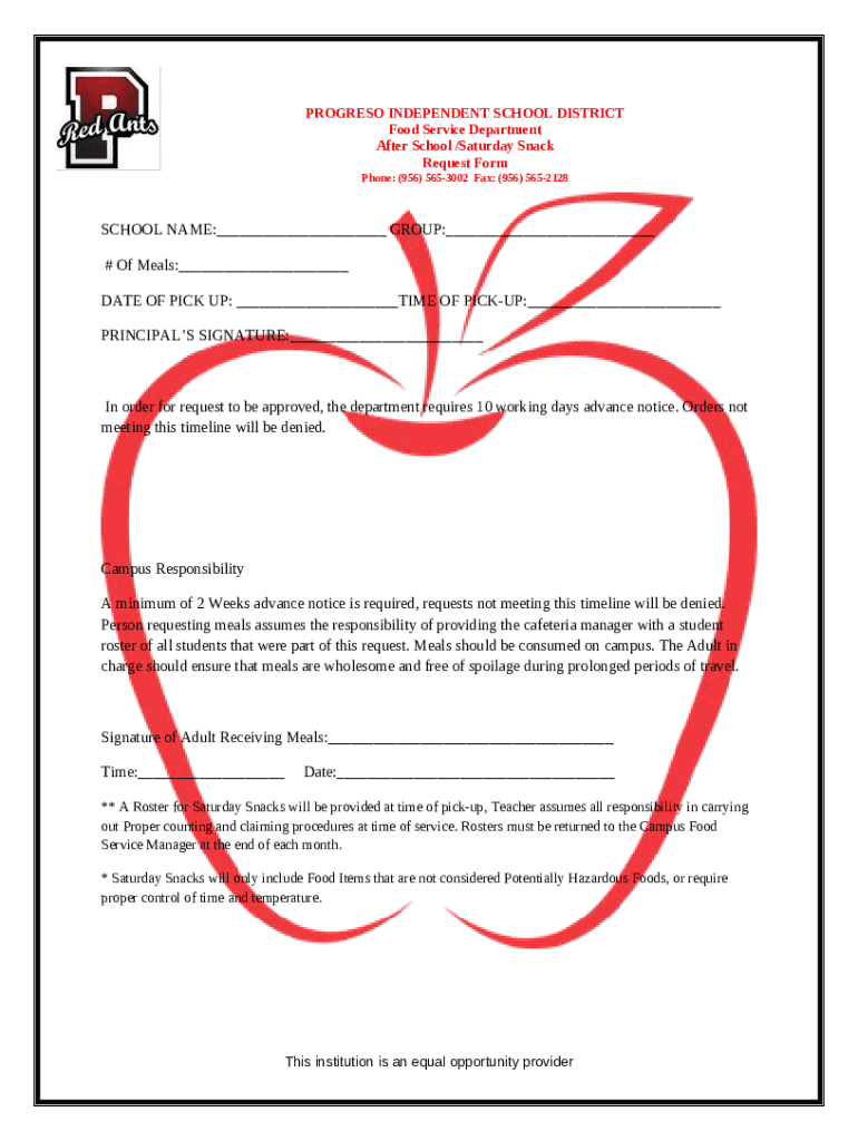 The after school Saturday snack form serves as an essential document that outlines the specifics of snack provision for after-school programs. Its primary purpose is to facilitate clear communication among parents, coordinators, and volunteers regarding the snacks to be provided. The form ensures that all logistical aspects, including snack options, quantities, dietary restrictions, and vendor information, are meticulously planned and documented.