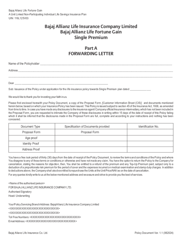 Bajaj Allianz Life Fortune Gain A Unit Linked NonParticipating Individual Life Savings Insurance Plan UIN: 116L125V03Bajaj Allianz Life Insurance Company Limited Bajaj Allianz Life Fortune Gain Single Premium Part A FORWARDING LETTER Name of the Policyholder ___ Address ______ Dear ___ Sub: Issuance of the Policy under application for the life insurance policy towards Single Premium plan dated ___ We would like to thank you for investing your faith in us. Please find enclosed herewith your...