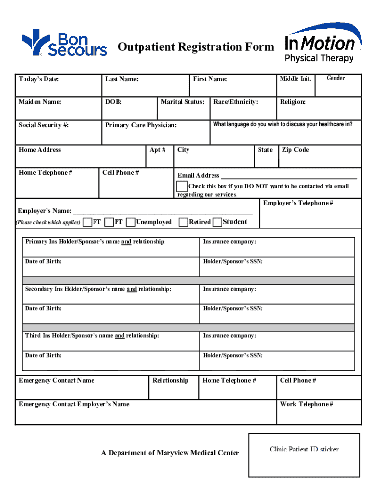 Outpatient Registration Form Todays Date:Last Name:Maiden Name:DOB:Social Security #:Primary Care Physician:Home AddressMarital Status:Apt #Home Telephone #Middle Init.First Name:Cell Phone #Race/Ethnicity:GenderReligion:What language do you wish to discuss your healthcare in?CityStateZip CodeEmail AddressCheck this box if you DO NOT want to be contacted via email regarding our services.Employers Name: ___ (Please check which applies)Employers
