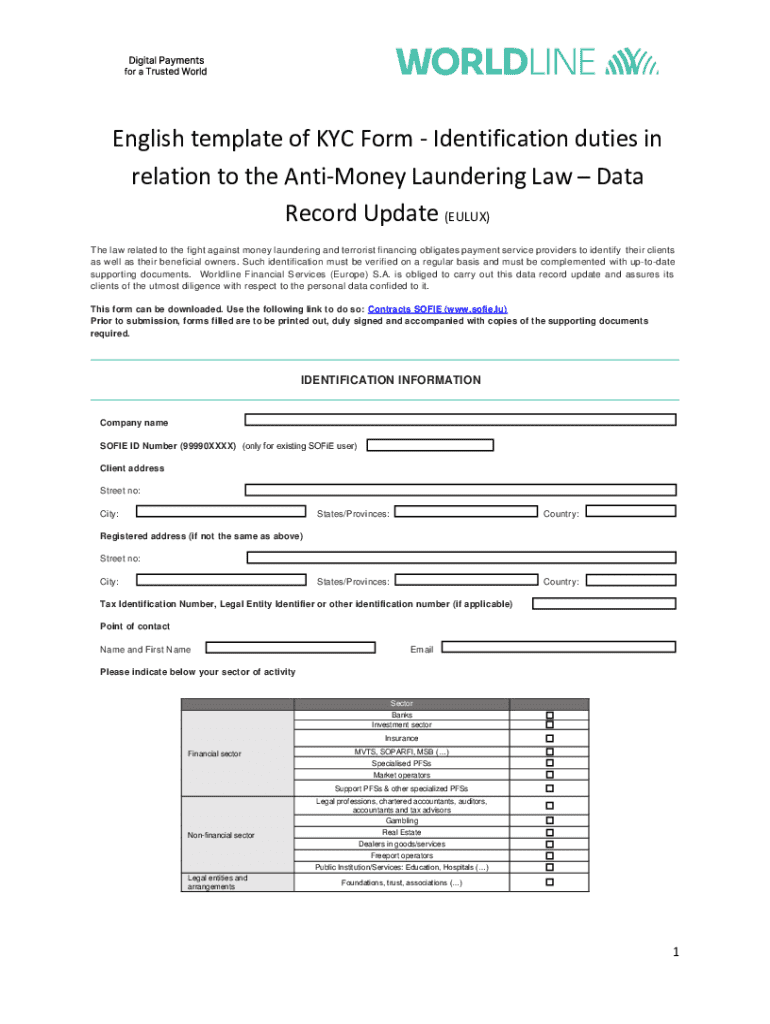 English template of KYC Form Identification duties in relation to the AntiMoney Laundering Law Data Record Update (EULUX) The law related to the fight against money laundering and terrorist financing obligates payment service providers to identify their clients as well as their beneficial owners. Such identification must be verified on a regular basis and must be complemented with uptodate supporting documents. Worldline Financial Services (Europe) S.A. is obliged to carry out this data