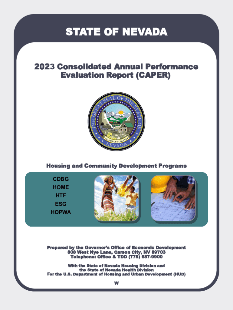 STATE OF NEVADA 2023 Consolidated Annual Performance Evaluation Report (CAPER)Housing and Community Development Programs CDBGHOME HTF ESG HOPWAPrepared by the Governors Office of Economic Development 808 West Nye Lane, Carson City, NV 89703 Telephone: Office & TDD (775) 6879900 With the State of Nevada Housing Division and the State of Nevada Health Division For the U.S. Department of Housing and Urban Development (HUD)WState of Nevada 2023 Consolidated Annual Performance and Evaluation
