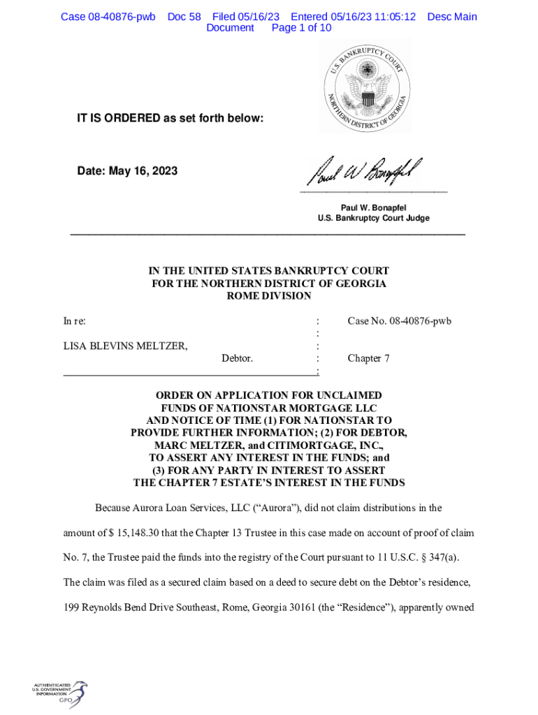 Case 0840876pwbDoc 58Filed 05/16/23 Entered 05/16/23 11:05:12 Document Page 1 of 10Desc MainIT IS ORDERED as set forth below:Date: May 16, 2023 ___ Paul W. Bonapfel U.S. Bankruptcy Court Judge___IN THE UNITED STATES BANKRUPTCY COURT FOR THE NORTHERN DISTRICT OF GEORGIA ROME DIVISION In re: LISA BLEVINS MELTZER, Debtor.: : : : :Case No. 0840876pwb Chapter 7ORDER ON APPLICATION FOR UNCLAIMED FUNDS OF NATIONSTAR MORTGAGE LLC AND NOTICE OF TIME (1) FOR NATIONSTAR TO PROVIDE FURTHER