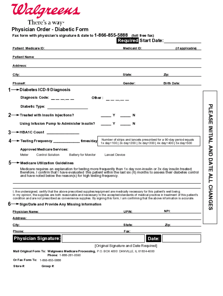 Physician Order Diabetic Form Fax form with physician\'s signature & date to 18668555888 (toll free fax)Required Start Date: Patient Medicare ID:Medicaid ID:(if applicable)Patient Name: Address:1City:State:Zip:Phone#:Gender:Birth Date:Diabetes ICD9 Diagnosis Diagnosis Code:Other :..2Treated with Injections?___ Y___ NUsing Infusion Pump to Administer ?___ Y___ N3HBA1C Count ___4Testing Frequency ___ times/dayNumber of strips