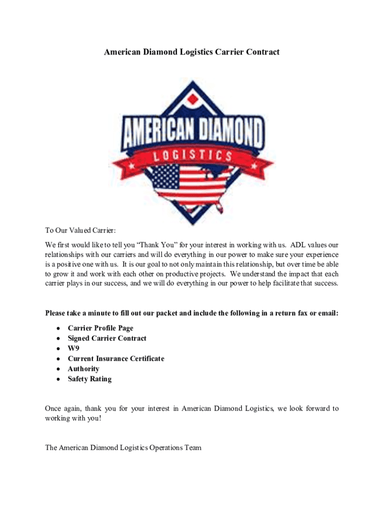 American Diamond Logistics Carrier ContractTo Our Valued Carrier: We first would like to tell you Thank You for your interest in working with us. ADL values our relationships with our carriers and