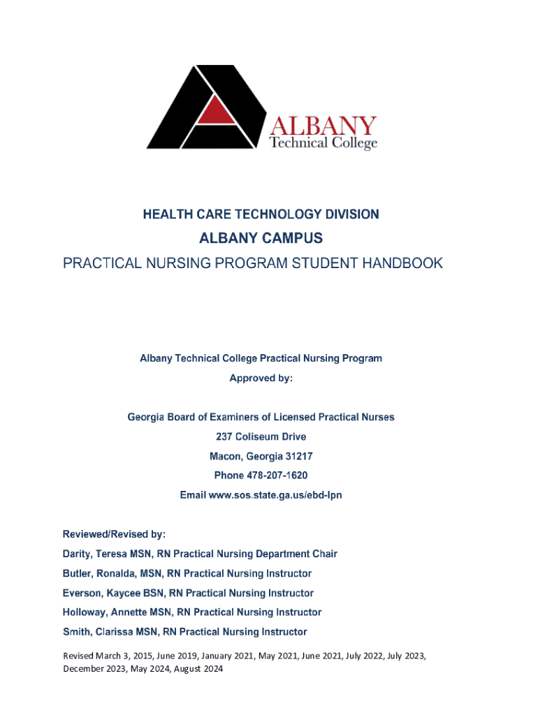 Revised March 3, 2015, June 2019, January 2021, May 2021, June 2021, July 2022, July 2023, December 2023, May 2024, August 2024PREFACE This Department of Practical Nursing Student Handbook is designed to share information, procedures, and policies specific to students enrolled in the practical nursing program at Albany Technical College. The information presented here will be helpful as you negotiate your way through the nursing program. Our expectation is that you will use this handbook as your