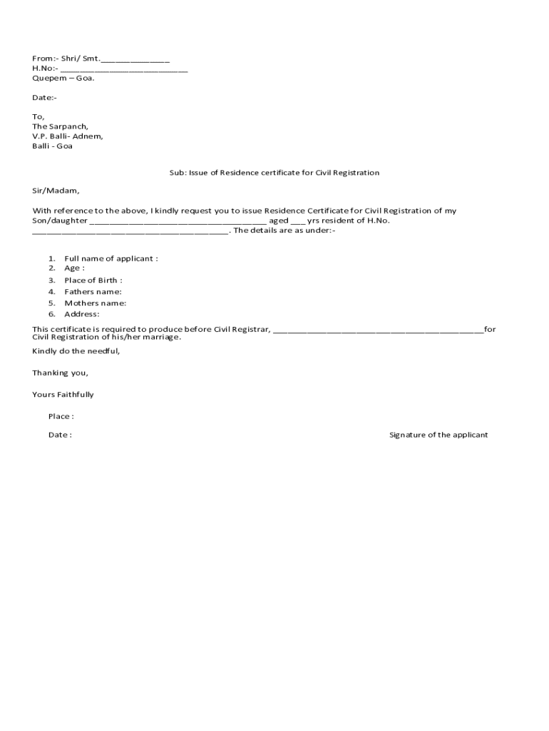 From: Shri/ Smt.___ H.No: ___ Quepem Goa. Date:To, The Sarpanch, V.P. Balli Adnem, Balli Goa Sub: Issue of Residence certificate for Civil RegistrationSir/Madam, With reference to the above, I kindly request you to issue Residence Certificate for Civil Registration of my Son/daughter ___ aged ___ yrs resident of H.No. ___. The details are as under:1. Full name of applicant : 2. Age : 3. 4. 5. 6.Place of Birth : Fathers name: Mothers name: Address:This certificate is required to
