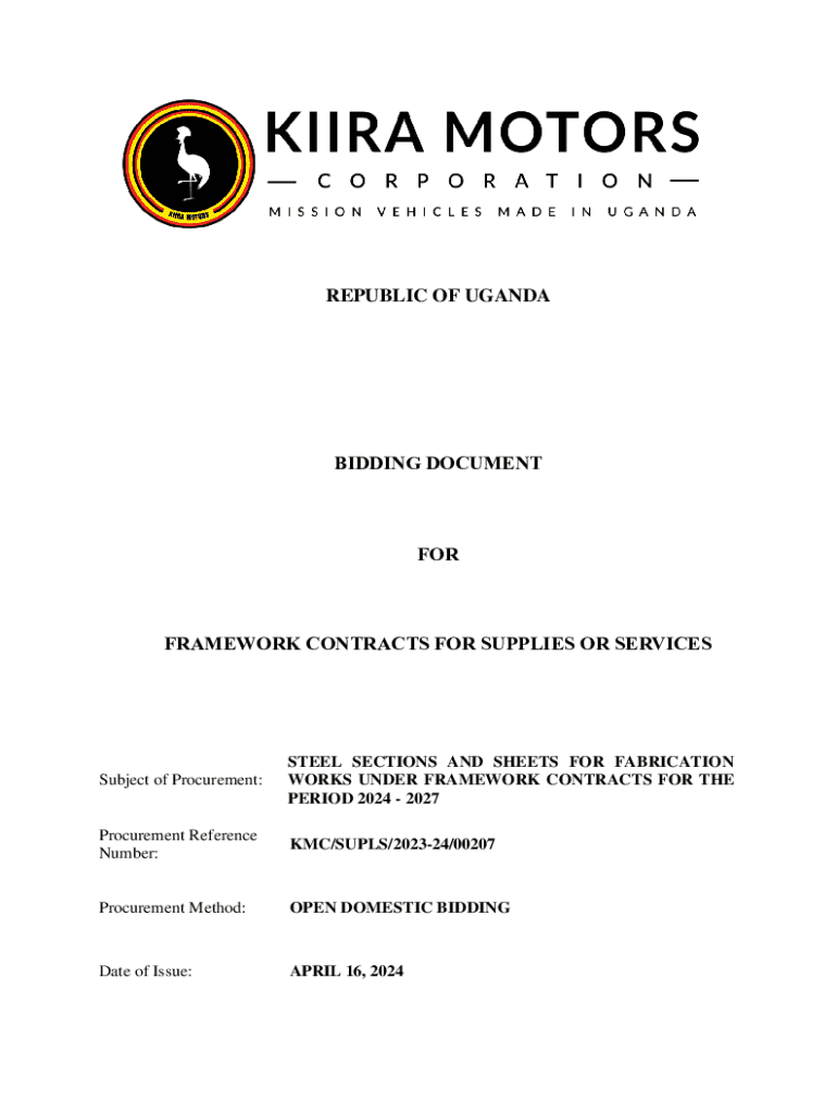 REPUBLIC OF UGANDABIDDING DOCUMENTFORFRAMEWORK CONTRACTS FOR SUPPLIES OR SERVICESSubject of Procurement:STEEL SECTIONS AND SHEETS FOR FABRICATION WORKS UNDER FRAMEWORK CONTRACTS FOR THE PERIOD 2024