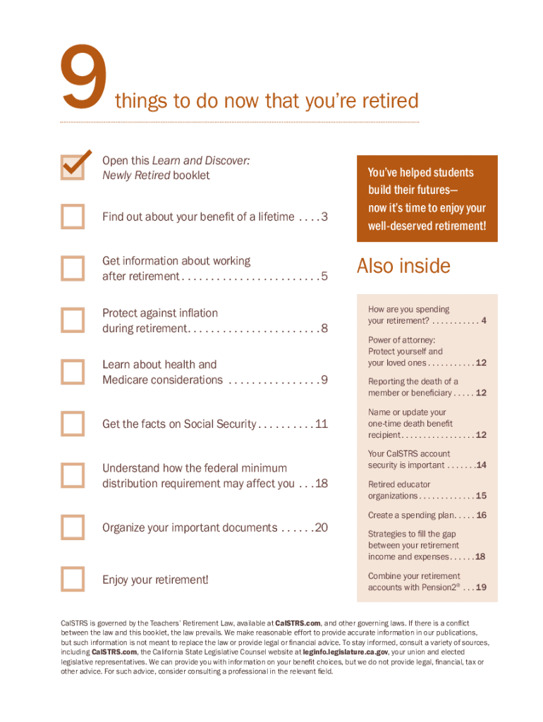 LEARN AND DISCOVER THE BENEFIT OF A LIFETIMENewly RetiredDear CalSTRS member, Congratulations on your retirement! As CalSTRS chief executive officer, I want to thank you for your dedicated career. Education is a challenging and rewarding profession, and I wish the best for your next phase of life. Take a few minutes to look through this Learn and Discover: Newly Retired publication. Youll find valuable information about working after retirement, inflation protection, the importance of