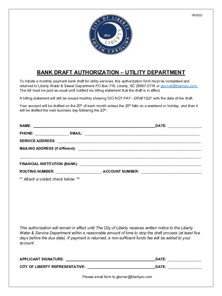 06/2023BANK DRAFT AUTHORIZATION UTILITY DEPARTMENT To initiate a monthly payment bank draft for utility services, this authorization form must be completed and returned to Liberty Water & Sewer Department PO Box 716, Liberty, SC 296570716 or gturner@libertysc.com. The bill must be paid as usual until notified via billing statement that the draft is in effect. A billing statement will still be issued monthly showing DO NOT PAY DRAFTED with the date of the draft. Your account will be