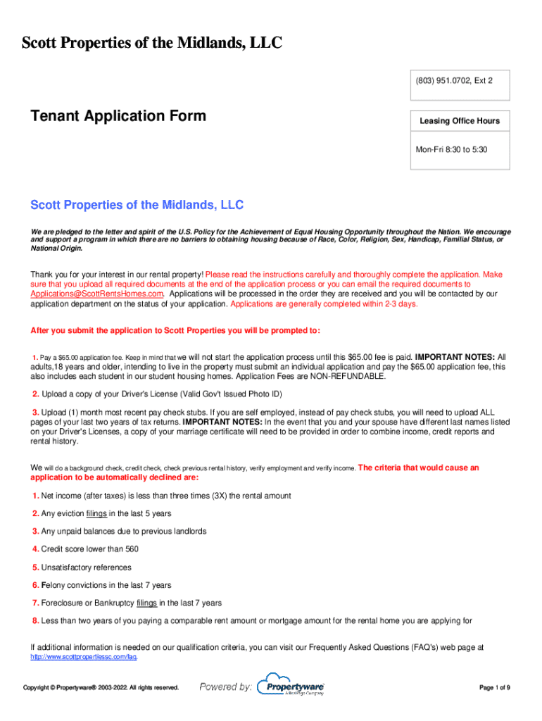 Scott Properties of the Midlands, LLC (803) 951.0702, Ext 2Tenant Application FormLeasing Office HoursMonFri 8:30 to 5:30Scott Properties of the Midlands, LLC We are pledged to the letter and spirit