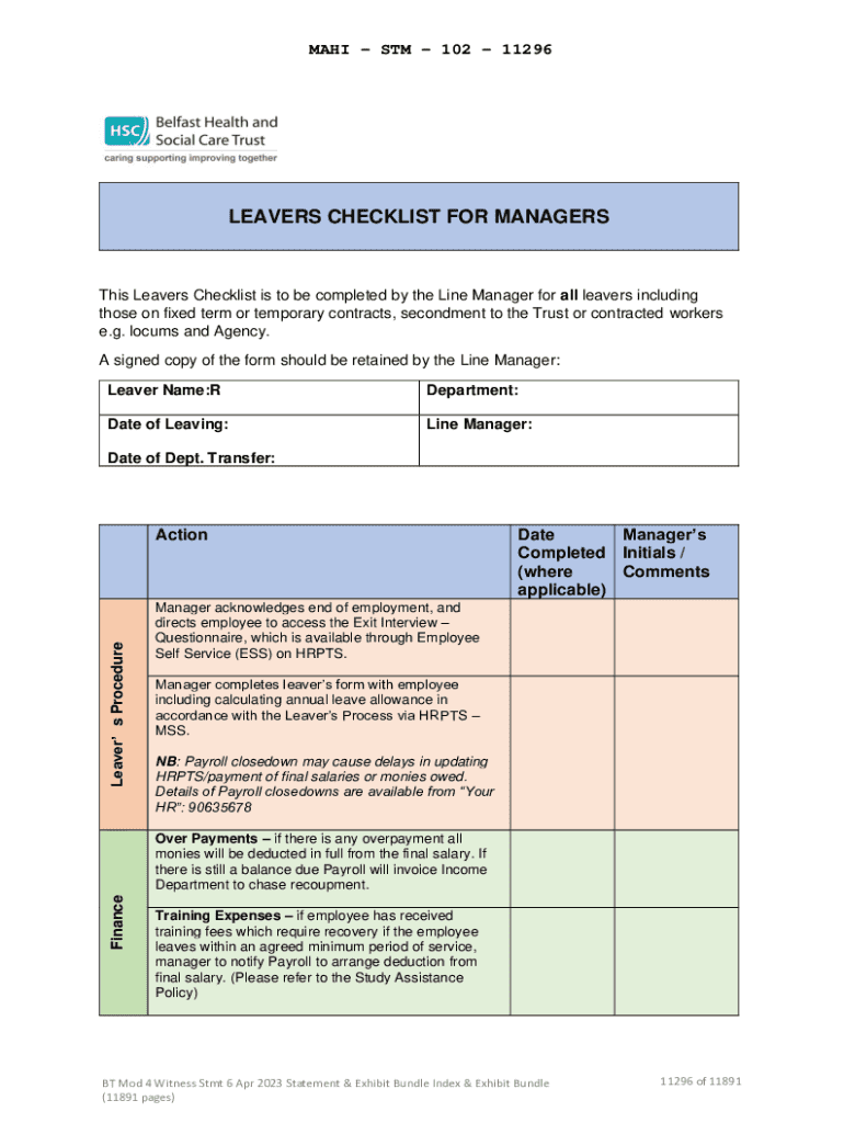 A comprehensive leavers checklist must include a variety of essential documents and actions that are critical for both compliance and the smooth transition of responsibilities. First, clear final pay arrangements must be outlined, ensuring that the departing employee fully understands their financial benefits upon exit. This includes detailing any remaining wages, accrued holiday pay, and any severance arrangements.