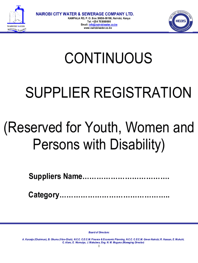 NAIROBI CITY WATER & SEWERAGE COMPANY LTD. KAMPALA RD, P. O. Box 3065600100, Nairobi, Kenya Tel: +254 703080000 Email: info@nairobiwater.co.ke www.nairobiwater.co.keCONTINUOUS SUPPLIER REGISTRATION (Reserved for Youth, Women and Persons with Disability) Suppliers Name. Category..Board of Directors: A. Karanja (Chairman), B. Okumu (ViceChair), N.C.C. C.E.C.M. Finance & Economic Planning, N.C.C. C.E.C.M. Green Nairobi, R