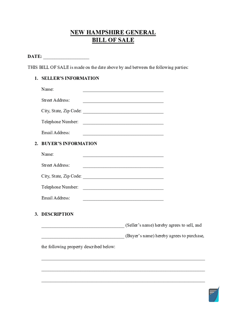 NEW HAMPSHIRE GENERAL BILL OF SALE DATE: ___ THIS BILL OF SALE is made on the date above by and between the following parties: 1. SELLERS INFORMATION Name:___Street Address:___City, State, Zip Code: