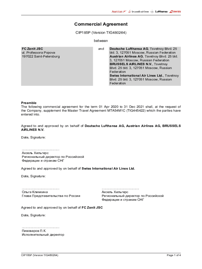 Commercial Agreement CIP185P (Version TIG480264) between FC Zenit JSC ul. Professora Popova 197022 SaintPetersburgandDeutsche Lufthansa AG, Tsvetnoy Blvd. 25 bld. 3, 127051 Moscow, Russian Federation Austrian Airlines AG, Tsvetnoy Blvd. 25 bld. 3, 127051 Moscow, Russian Federation BRUSSELS AIRLINES N.V., Tsvetnoy Blvd. 25 bld. 3, 127051 Moscow, Russian Federation Swiss International Air Lines Ltd., Tsvetnoy Blvd. 25 bld. 3, 127051 Moscow, Russian FederationPreamble The following commercial