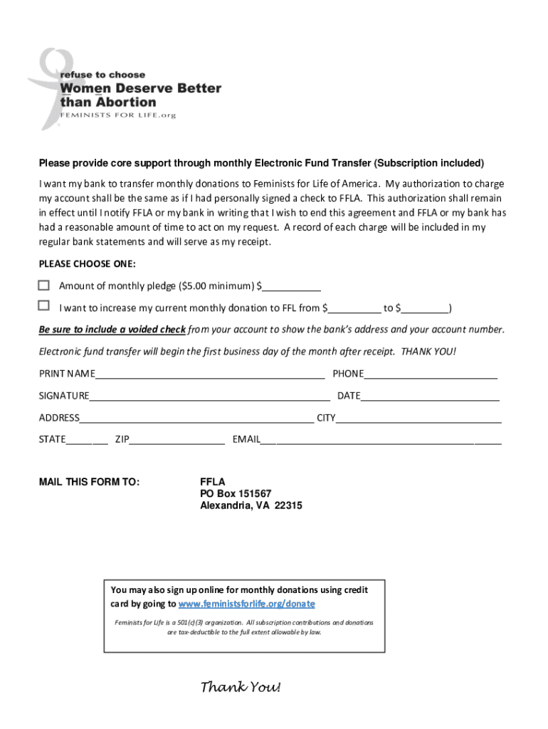 Please provide core support through monthly Electronic Fund Transfer (Subscription included)I want my bank to transfer monthly donations to Feminists for Life of America. My authorization to charge my account shall be the same as if I had personally signed a check to FFLA. This authorization shall remain in effect until I notify FFLA or my bank in writing that I wish to end this agreement and FFLA or my bank has had a reasonable amount of time to act on my request. A record of each charge will