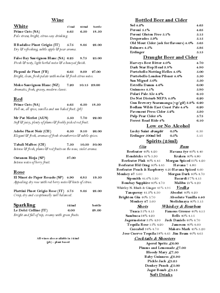 A drinks menu serves as a curated list highlighting beverage options available to patrons, ranging from cocktails and wines to non-alcoholic drinks. An effective drinks menu not only showcases the offerings but also embodies the establishment's brand and atmosphere, particularly important in busy months like November when seasonal beverages can attract customers.