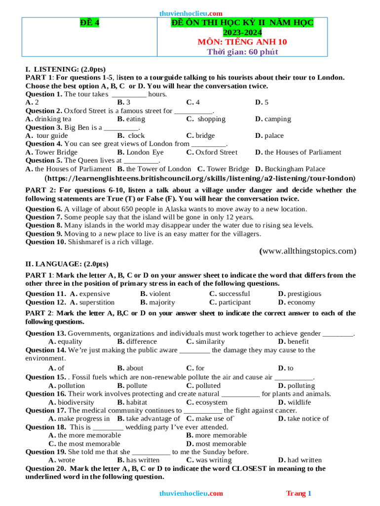 The n Thi HK2 Ting Anh 10 Global Success C p n ... is a fillable form in MS Word extension you can get completed and signed for certain needs. In that case, it is furnished to the actual addressee in order to provide some information of certain kinds. The completion and signing can be done manually in hard copy or via a suitable service e. g. PDFfiller. These services help to submit any PDF or Word file without printing out. While doing that, you can customize it depending on your requirements and put a valid digital signature. Once finished, the user ought to send the n Thi HK2 Ting Anh 10 Global Success C p n ... to the respective recipient or several recipients by email or fax. PDFfiller has a feature and options that make your blank printable. It provides a variety of settings for printing out. No matter, how you will send a form after filling it out - in hard copy or by email - it will always look well-designed and firm. To not to create a new file from the beginning every time, turn the original form into a template. Later, you will have a rewritable sample.