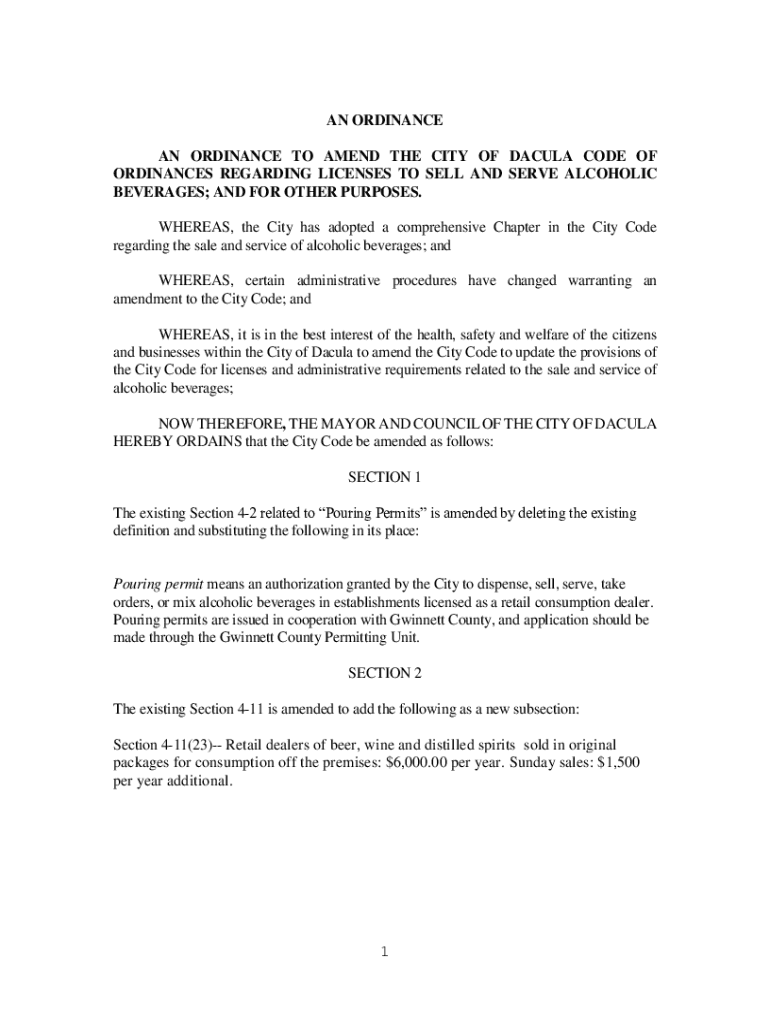 AN ORDINANCE AN ORDINANCE TO AMEND THE CITY OF DACULA CODE OF ORDINANCES REGARDING LICENSES TO SELL AND SERVE ALCOHOLIC BEVERAGES; AND FOR OTHER PURPOSES. WHEREAS, the City has adopted a comprehensive Chapter in the City Code regarding the sale and service of alcoholic beverages; and WHEREAS, certain administrative procedures have changed warranting an amendment to the City Code; and WHEREAS, it is in the best interest of the health, safety and welfare of the citizens and businesses within...